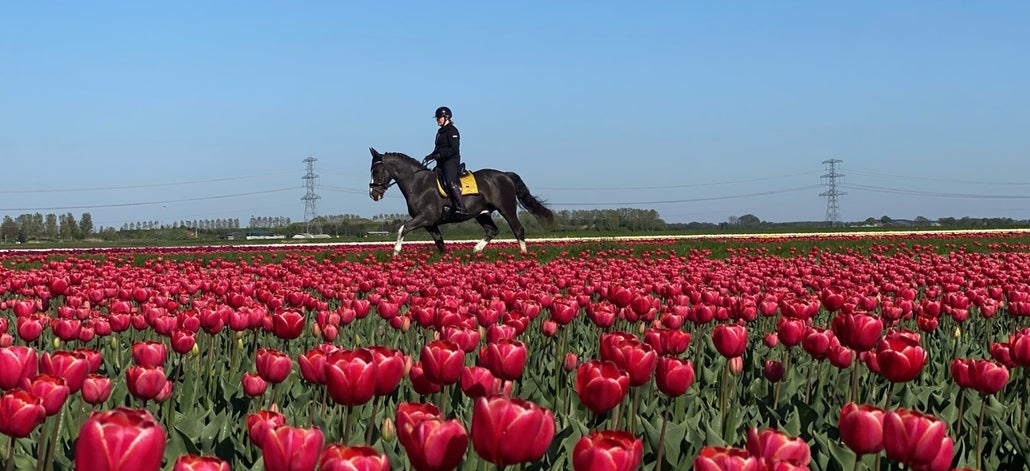 Hieronder zie je mij met Thabor door een tulpenveld rijden, nooit verwacht ooit dit te kunnen doen met hem en kijk waar we zijn en dat dankzij het freestyle systeem